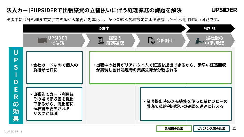 出張旅費の立替払いや法人カード利用に伴う経理業務の手間や、出張社員による不正利用といった課題を抱えている企業様に向けて、法人カードUPSIDERを活用することで得られる「業務効率面」「ガバナンス面」の改善効果をご提示しています。