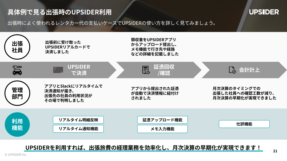 - UPSIDERの独自機能によって出張旅費の法人カード利用の問題がどのように解決されるか