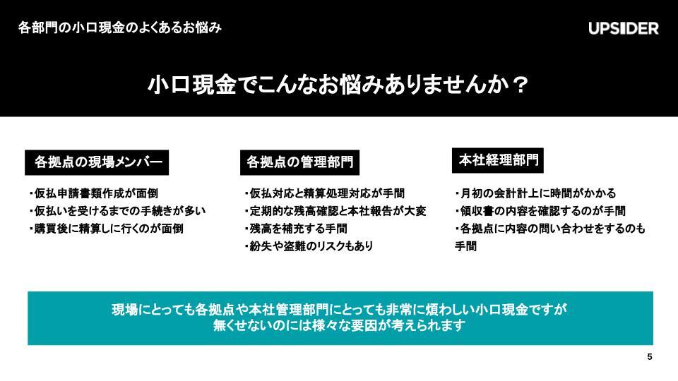 - 全国各地にある拠点で⼩⼝現⾦精算を⾏なっており、管理⼯数が膨⼤
