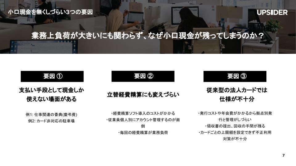 拠点ごとに管理している小口現金を無くしたいけどなかなか無くせない…法人カードを使ってはいるけど機能が物足りなくて小口現金が残る…そんな小口現金に関するよくあるお悩みをまとめ、どうして無くせないのか、削減のためにはどうしたらいいのかについて解説しています。