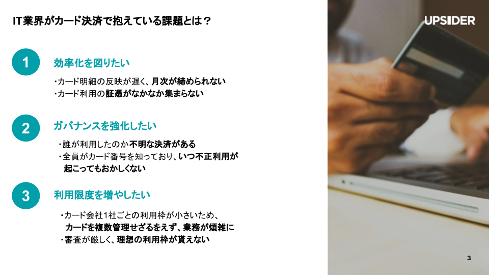 本資料では、これまでUPSIDERを導入していただいた企業様の中でIT企業を中心にどのような活用をして業務効率化を成し遂げたかをまとめてご紹介します。IT業界がカード決済で抱えている課題についても解説しております。