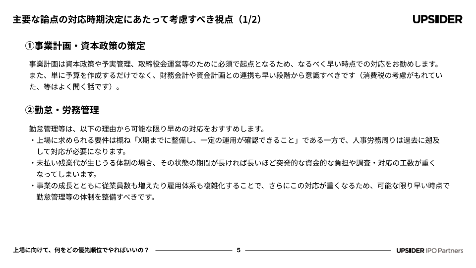 本資料では「上場準備、何を最優先に動くべき?」をテーマに、上場に向けて主要な論点の対応時期決定にあたって考慮すべき視点やIPOまでの重要タスクやスケジュールなどについて解説しています。