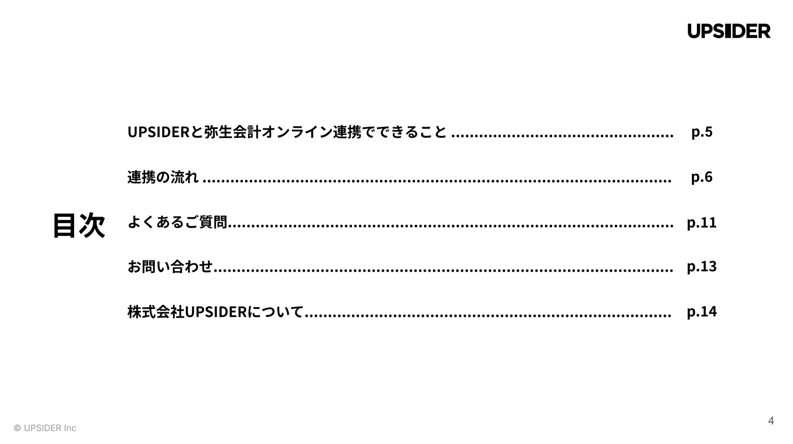 本資料では、よくお問い合わせいただくUPSIDERと弥生会計オンラインの連携について詳しく解説します。弥生会計オンラインを現在使われている方は是非ご覧ください。